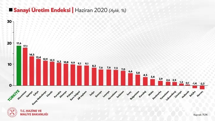 Sanayi Üretimi Endeksindeki %17,6'lık artışla Türkiye, haziran ayında Avrupa sıralamasında ilk sırada yer aldı. Öncü ekonomik göstergelerdeki güçlü toparlanma, büyüme rakamlarıyla ilgili karamsar beklenti içerisinde olanları inşaallah bir kez daha hayal kırıklığına uğratacak. pic.twitter.com/iiblmUSAMb