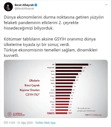 Bakan Albayrak, "Dünya ekonomilerini durma noktasına getiren yüzyılın felaketi pandeminin etkilerini 2. çeyrekte hissedeceğimizi biliyorduk. Kötümser tabloların aksine GSYİH oranımız dünya ülkelerine kıyasla iyi bir sonuç verdi. Türkiye ekonomisinin temelleri sağlam, dinamikleri kuvvetli." dedi.
